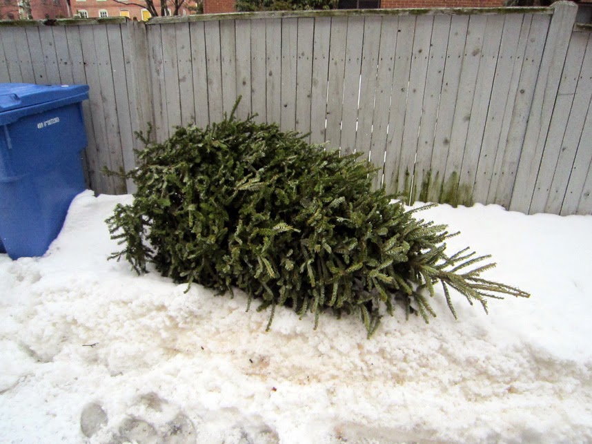 We had a large collection of about 6 trees sitting out by the dumpster after Christmas. (By the way, everyone did a great job of not putting their tree into the dumpster this year, thank you!) Markwood paid maintenance to come and dispose of the trees, since we were too late putting them out by the curb for city pick-up. With this late addition, rather than having it taken all at once with the other trees, now Markwood has to pay maintenance to come again and dispose of this one tree. Hopefullly next year, everyone will be on board with getting rid of their tree in a timely fashion.